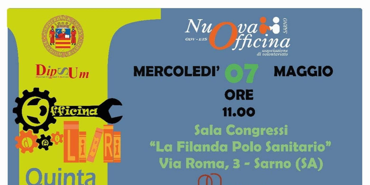 Primo appuntamento della Kermesse letteraria "L'Officina dei Libri", Mercoledì 07 Maggio 2025 alle ore 11, presso la Sala Congressi "La Filanda Polo Sanitario", Via Roma 3 a Sarno (SA).
